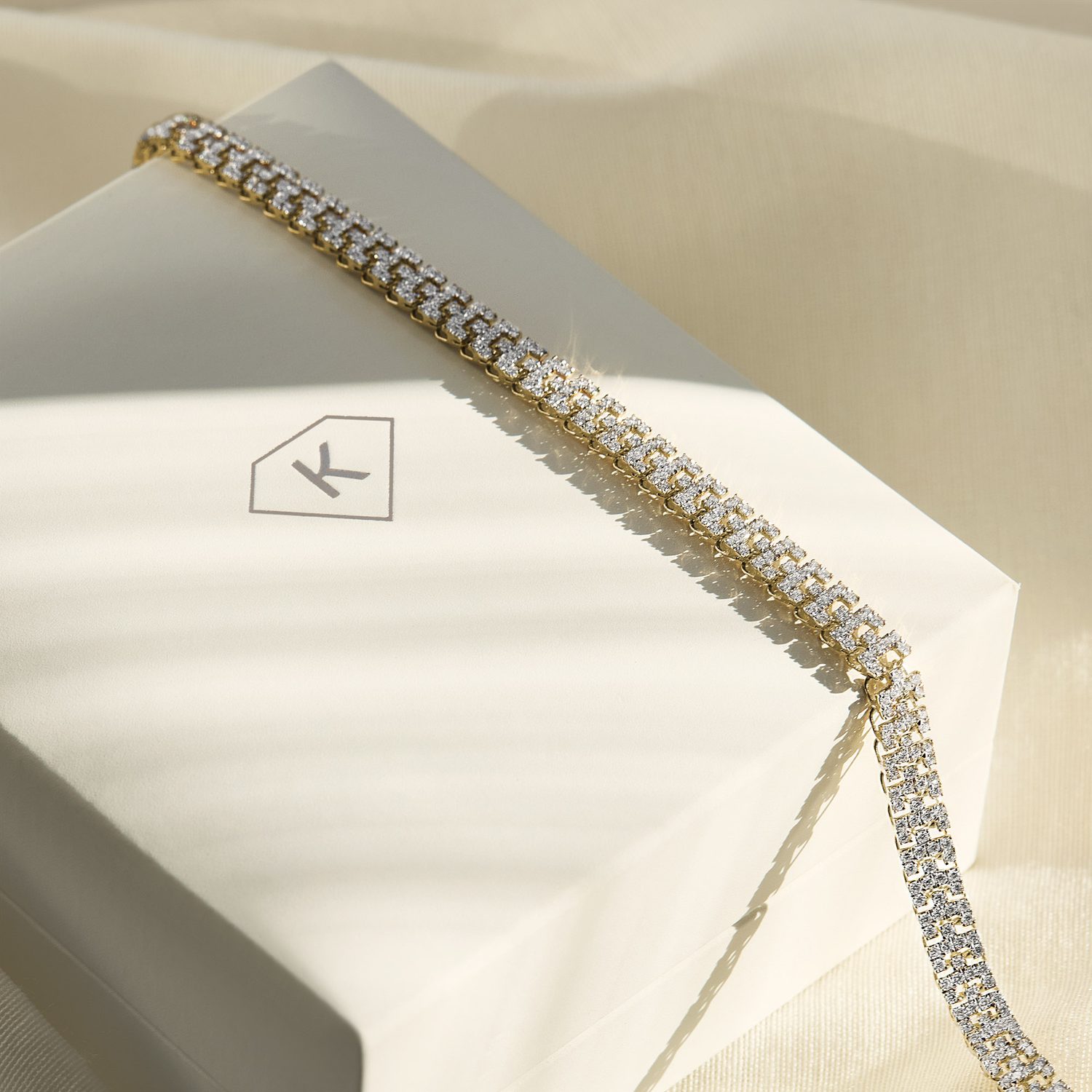 Tenisový náramek je ikonický design, který se vyznačuje řadou drobných diamantů nebo drahokamů zasazených do zlata plynule obepínajících celé zápěstí. Tento šperk je ztělesněním dokonalého luxusu. Za perfektní doplněk pro nevěsty je považován především proto, že v diamantové variantě působí mimořádně sofistikovaně a na ruce nevěsty, která je v centru pozornosti, krásně vynikne.