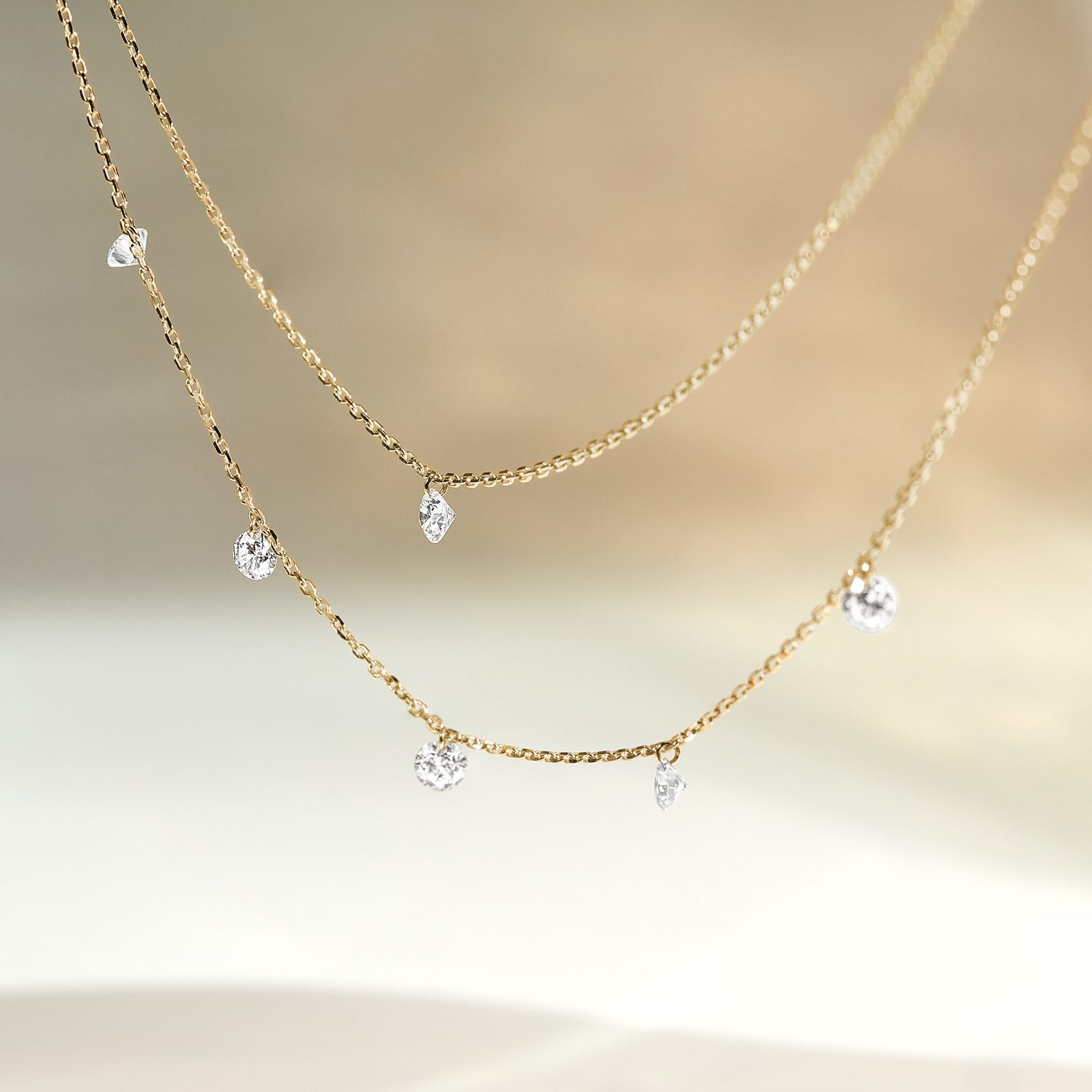 Volba náhrdelníku závisí především na střihu šatů. Pro hlubší výstřih do tvaru V jsou nejlichotivější jemné přívěsky, například ve tvaru srdce, s perlou nebo oblíbeným drahokamem. Kulatý výstřih může doplnit perlová šňůra ke krku z Akoya perel. U perel je navíc snadné si vybrat, zda bude náhrdelník působit minimalisticky nebo přepychově podle velikosti zvolených perel.