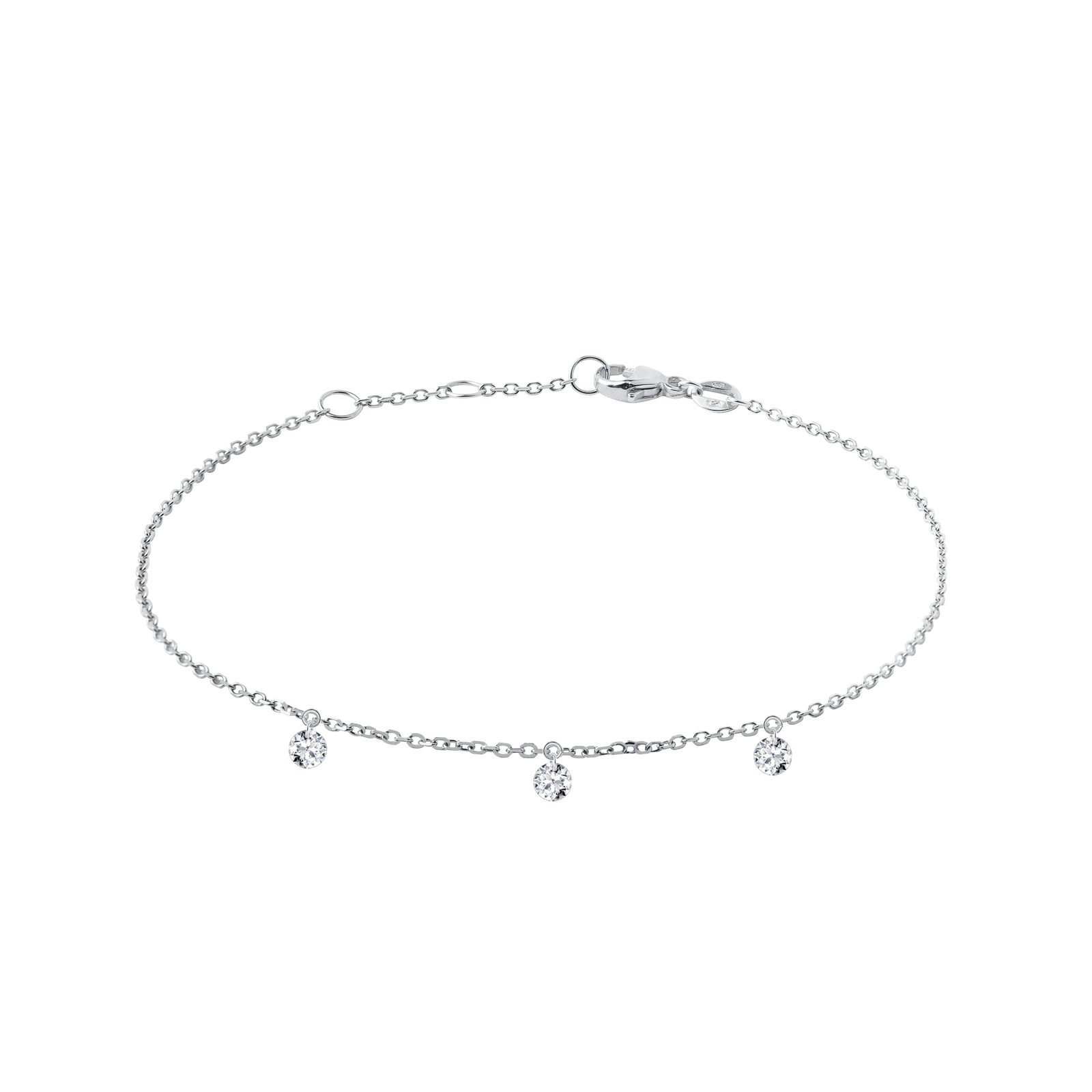 Klasický minimalistický náramek z bílého 14k zlata, ideální pro každodenní nošení. Zdobí ho tři čiré laboratorní diamanty kulatého tvaru, zavěšené technikou provrtání na jemném očku. Díky tomuto uchycení mohou kameny naplno odrážet světlo, což ještě více umocňuje jejich přirozený lesk a brilanci. Náramek je vyroben ve standardní délce 18 cm, kterou lze pomocí oček zkrátit na 17 až 16 cm.