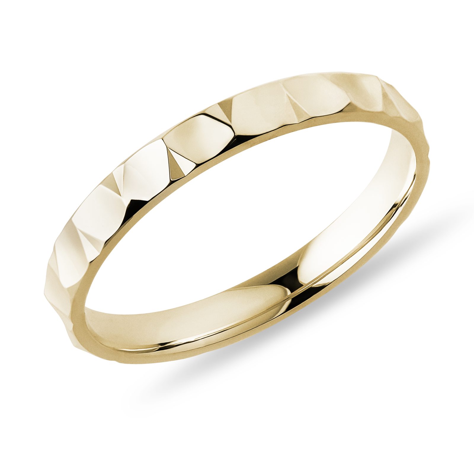 Originální pánský prsten ze žlutého 14karátového zlata o šířce 3 mm má po celém obvodu precizně broušené fasety, které mu dodávají výrazný geometrický vzhled. Lesklé hrany krásně odrážejí světlo a zvýrazňují jeho moderní, ale stále čistý charakter. Hodí se pro každodenní nošení i jako snubní prsten pro muže, kteří hledají osobitý, přesto vkusný design.