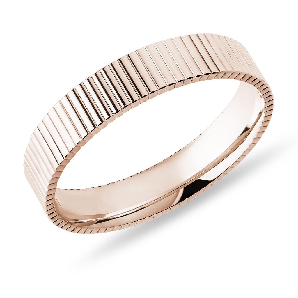 Pánský prsten z růžového 14karátového zlata o šířce 4,5 mm zdobí pravidelné svislé gravírování, které vytváří precizně strukturovaný povrch. Kombinace lesklých hran a detailního gravírování dodává prstenu čistý a designově zajímavý vzhled. Ideální volba pro muže, kteří preferují klasický styl obohacený o originálně řešený detail.