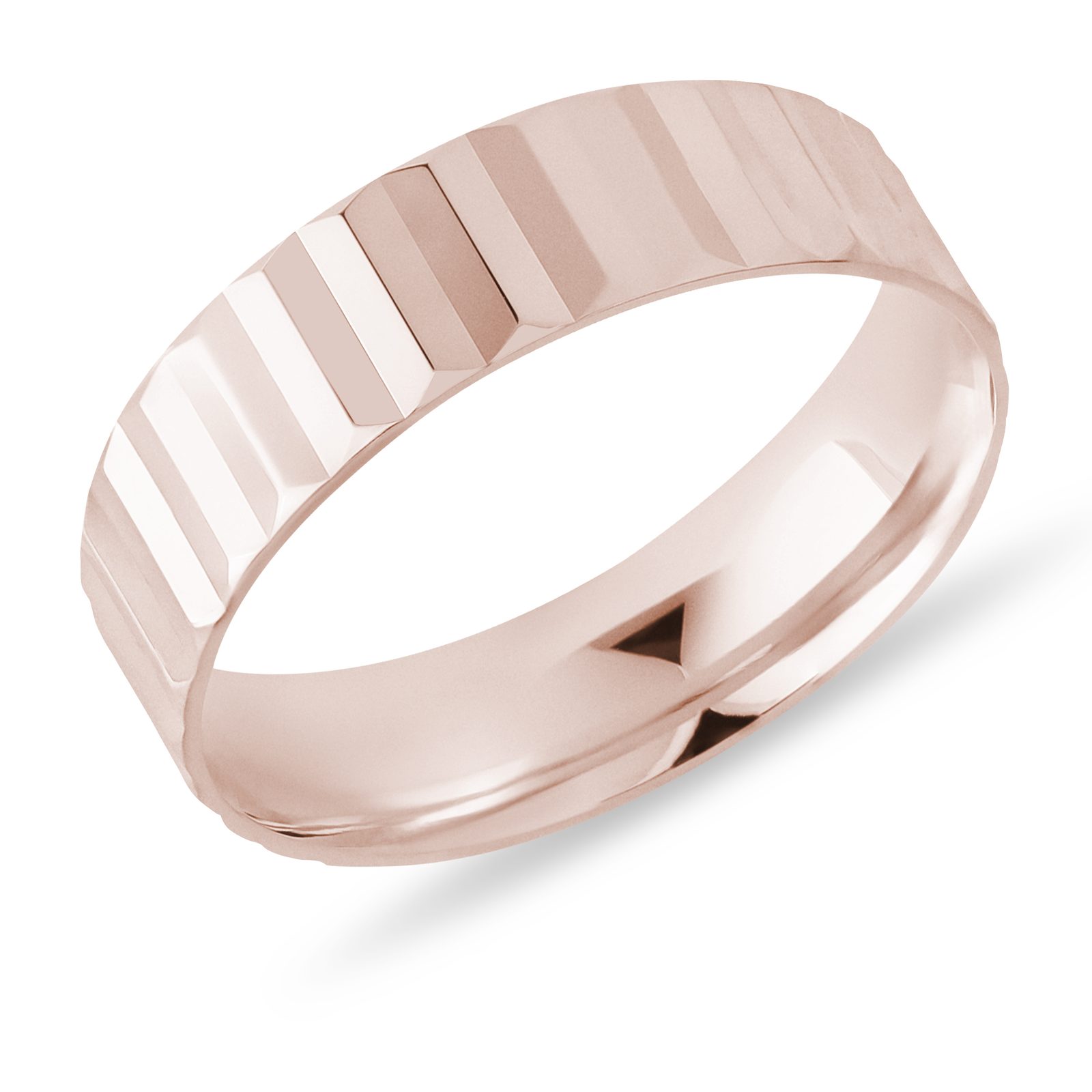 Stylový pánský prsten z růžového 14karátového zlata o šířce 6 mm s jemným plisé detailem, který v kombinaci s lesklým povrchem působí elegantně a nadčasově. Prsten vynikne samostatně, ale lze jej snadno kombinovat i s dalšími šperky. Díky svému univerzálnímu provedení je vhodný také jako snubní prsten pro muže, kteří hledají výraznější, ale stále nadčasový styl.