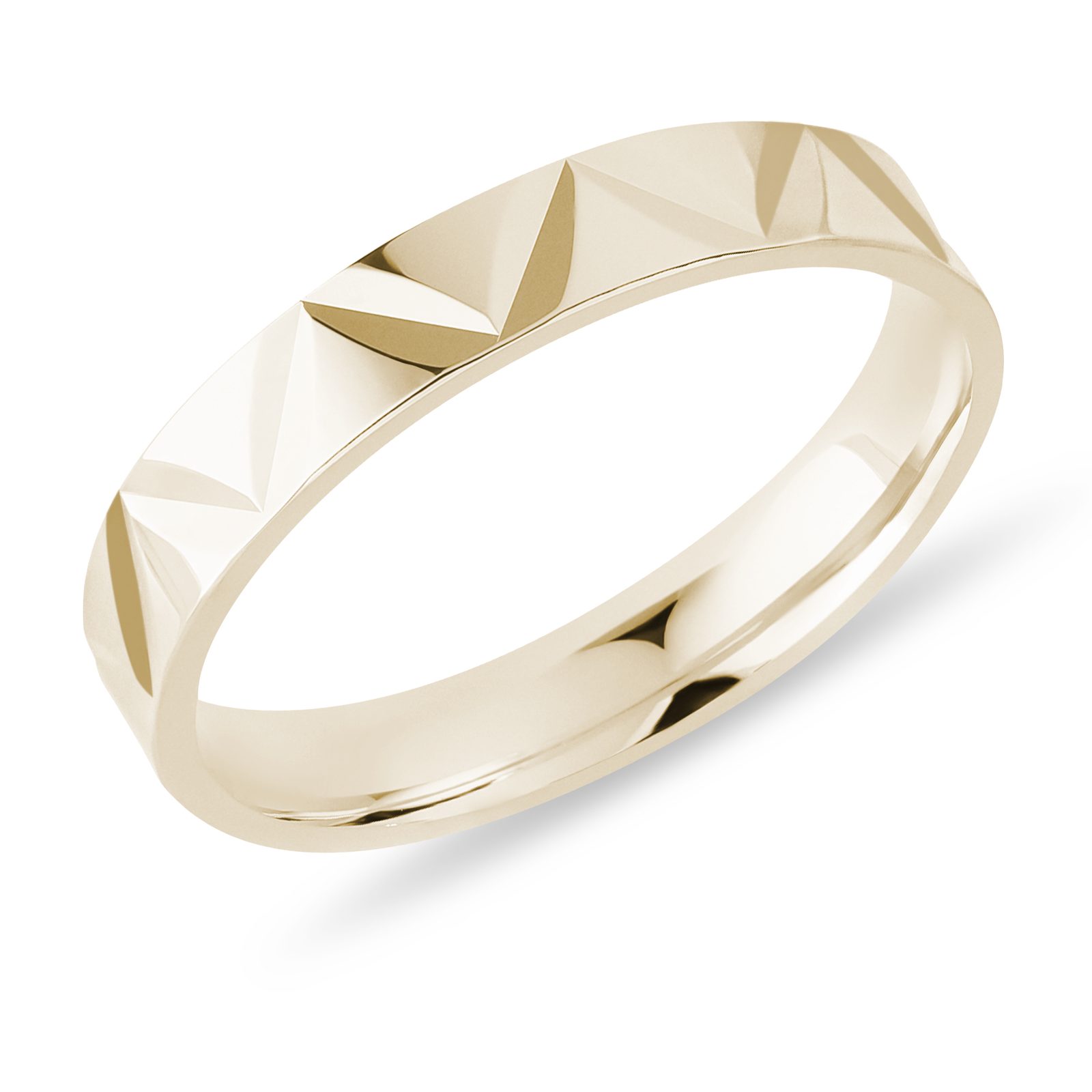 Moderní pánský snubní prsten ze žlutého 14k zlata o šířce 4 mm zaujme strukturovaným povrchem, který hezky odráží světlo. Spojuje klasický základ s jemným detailem, přesto si zachovává čistý a jednoduchý vzhled. Hodí se pro muže, kteří mají rádi pohodlí a originální styl.