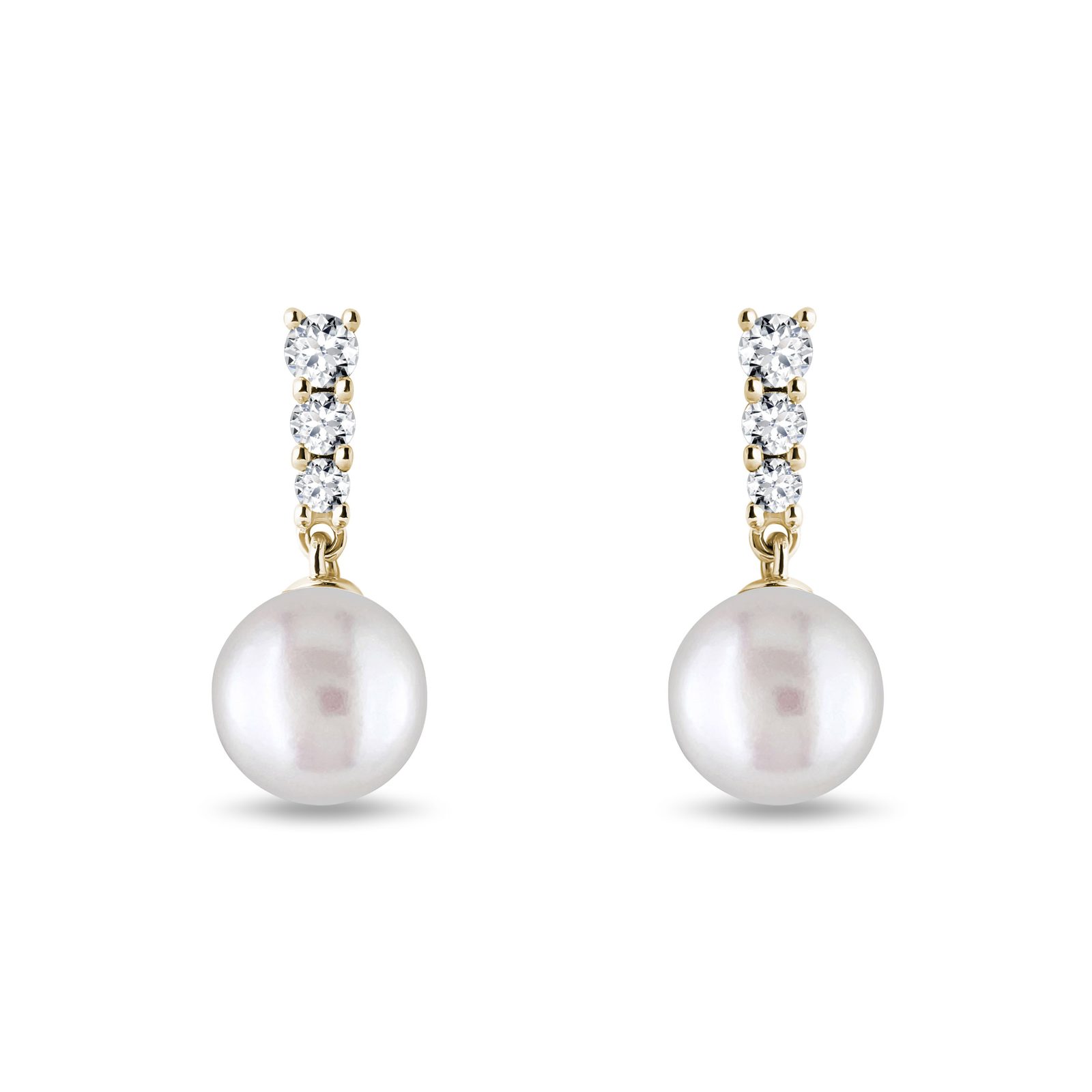 Elegantní náušnice ze žlutého 14k zlata, každou zdobí přírodní sladkovodní perla a tři čiré diamanty v kulatém brusu. Krásný doplněk, který sluší ženám každého věku.