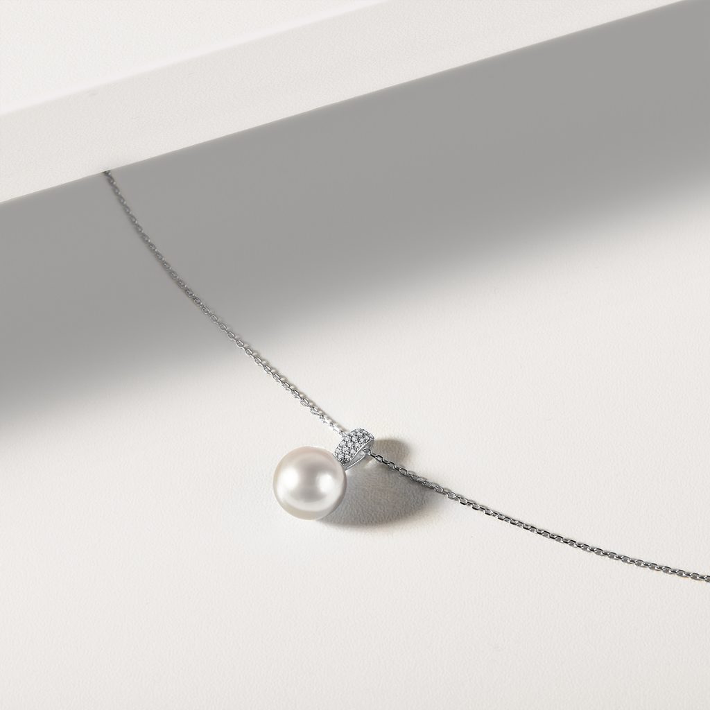 Elegantní přívěsek z bílého 14k zlata se sladkovodní perlou zavěšený na jemném řetízku typu ankr. Dokonale kulatá perla s přirozeným leskem a čistotou působí nadčasově a snadno se kombinuje s dalšími šperky. Ouško přívěsku je zdobené drobnými přírodními diamanty, jež dodávají šperku jemný třpyt a podtrhují jeho sofistikovaný charakter. Ideální doplněk pro každodenní nošení i slavnostní příležitosti.