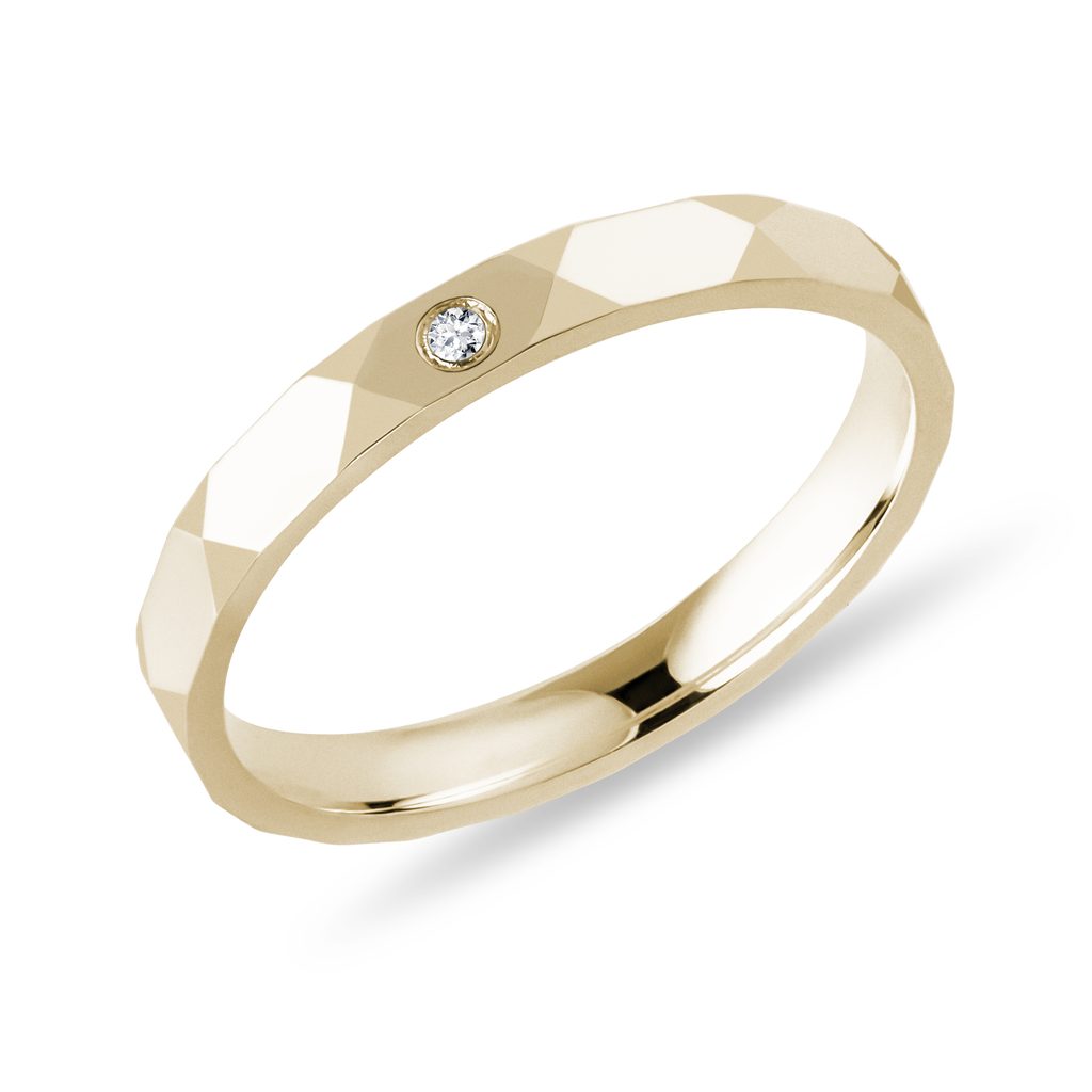 Dámský snubní prsten ve žlutém 14karátovém zlatě zaujme geometrickým strukturovaným povrchem doplněným čirým diamantem. Povrchová úprava s lesklými fasetami prsten originálně odlišuje od klasických hladkých modelů. Ideální volba pro ženy, které dávají přednost neotřelému stylu, jenž staví na precizním zpracování a promyšleném detailu.