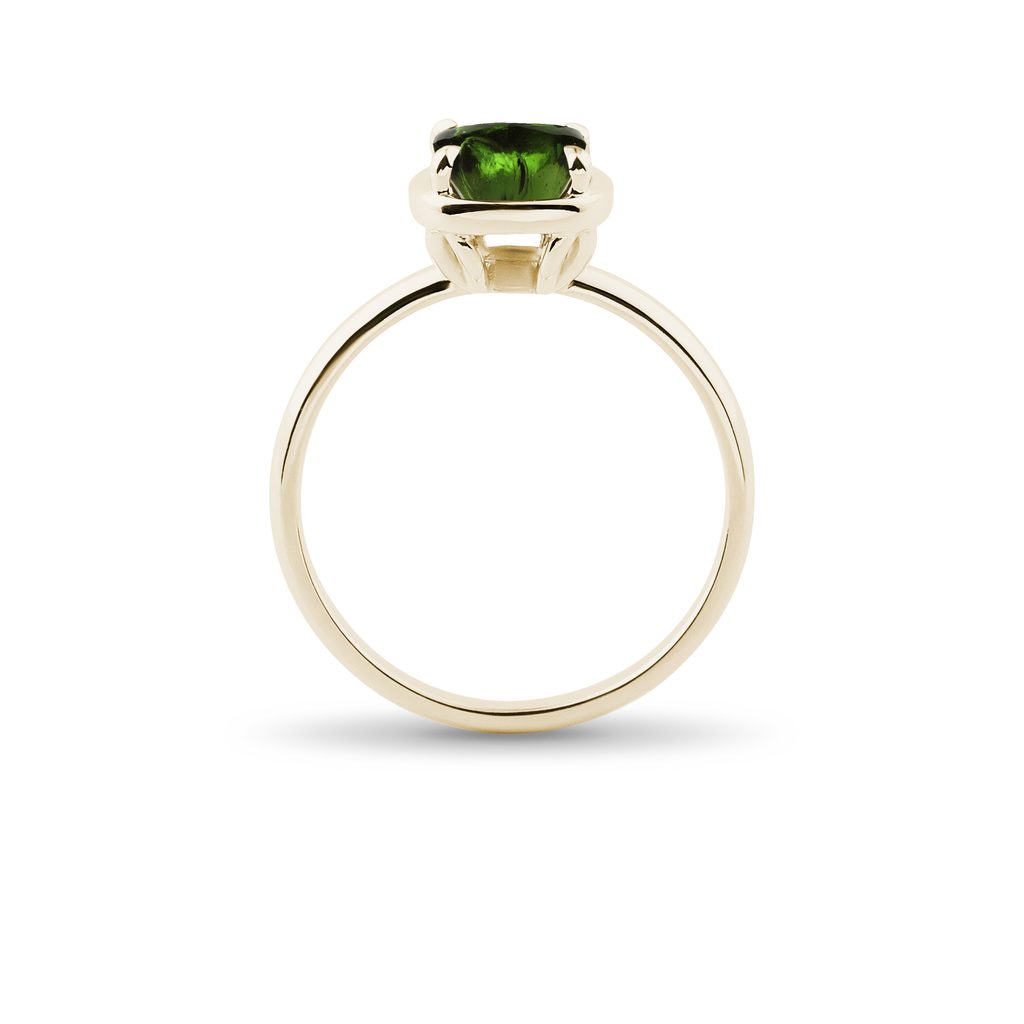 Jednoduchý prstýnek ze žlutého 14k zlata zdobí výrazný zelený vltavín v brusu cushion o rozměrech 6 × 6 mm, který vyniká svou jedinečnou barvou a krásou. Tento šperk je skvělým tipem na dárek pro ženy, které mají rády typicky české přírodní drahokamy a ocení hřejivé, zlaté tóny, jež dodají každodennímu stylu eleganci a šarm.