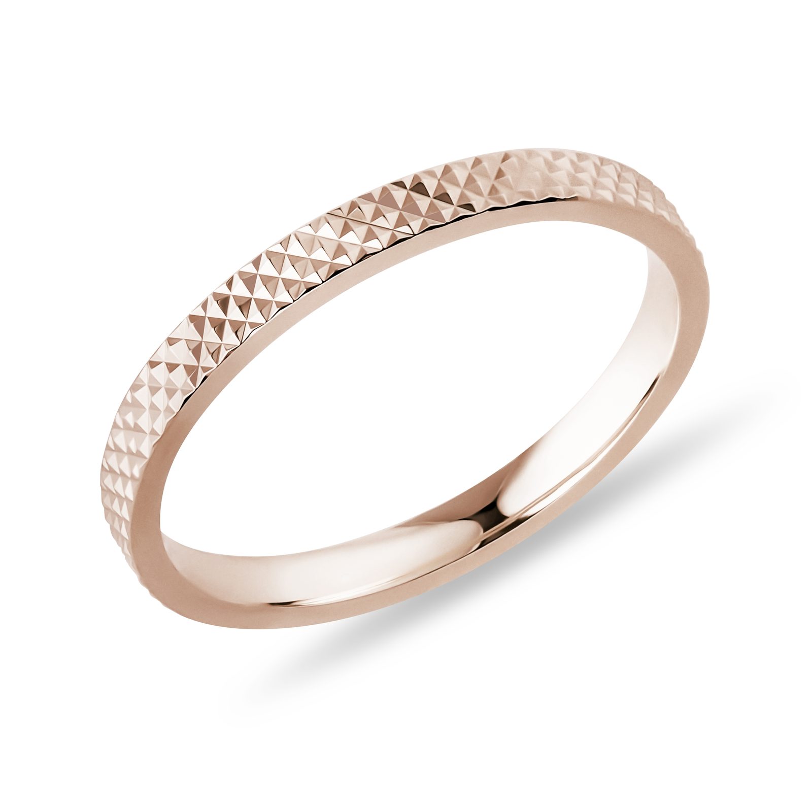 Dámský prsten o šířce 2 mm v růžovém 14k zlatě zaujme jemným vzorováním, které mu dodává moderní, ale stále velmi elegantní vzhled. Prsten je navržen pro pohodlné každodenní nošení a díky nadčasovému designu se hodí jako samostatný minimalistický doplněk, stejně tak i jako prsten k vrstvení.