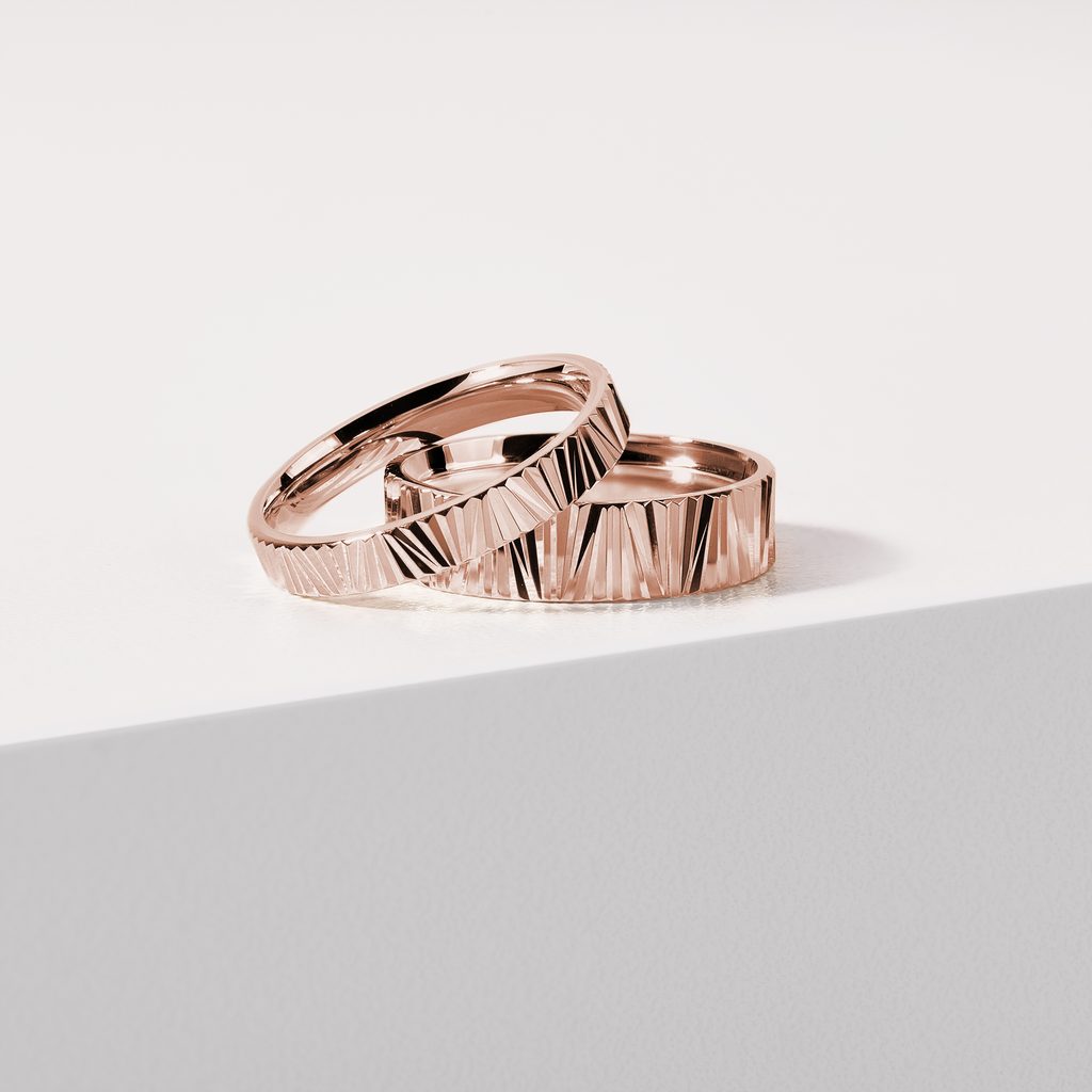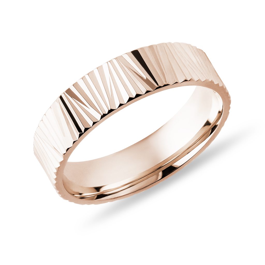 Dámský prsten z růžového zlata o šířce 5 mm zaujme výrazně strukturovaným povrchem, který tvoří jemné paprskovité fasety. Precizně ryté plošky krásně odrážejí světlo a při pohybu vytvářejí decentní třpyt, takže prsten působí moderně, ale pořád čistě a nadčasově. Ideální volba pro ženy, které hledají čistý, ale vizuálně zajímavý šperk.