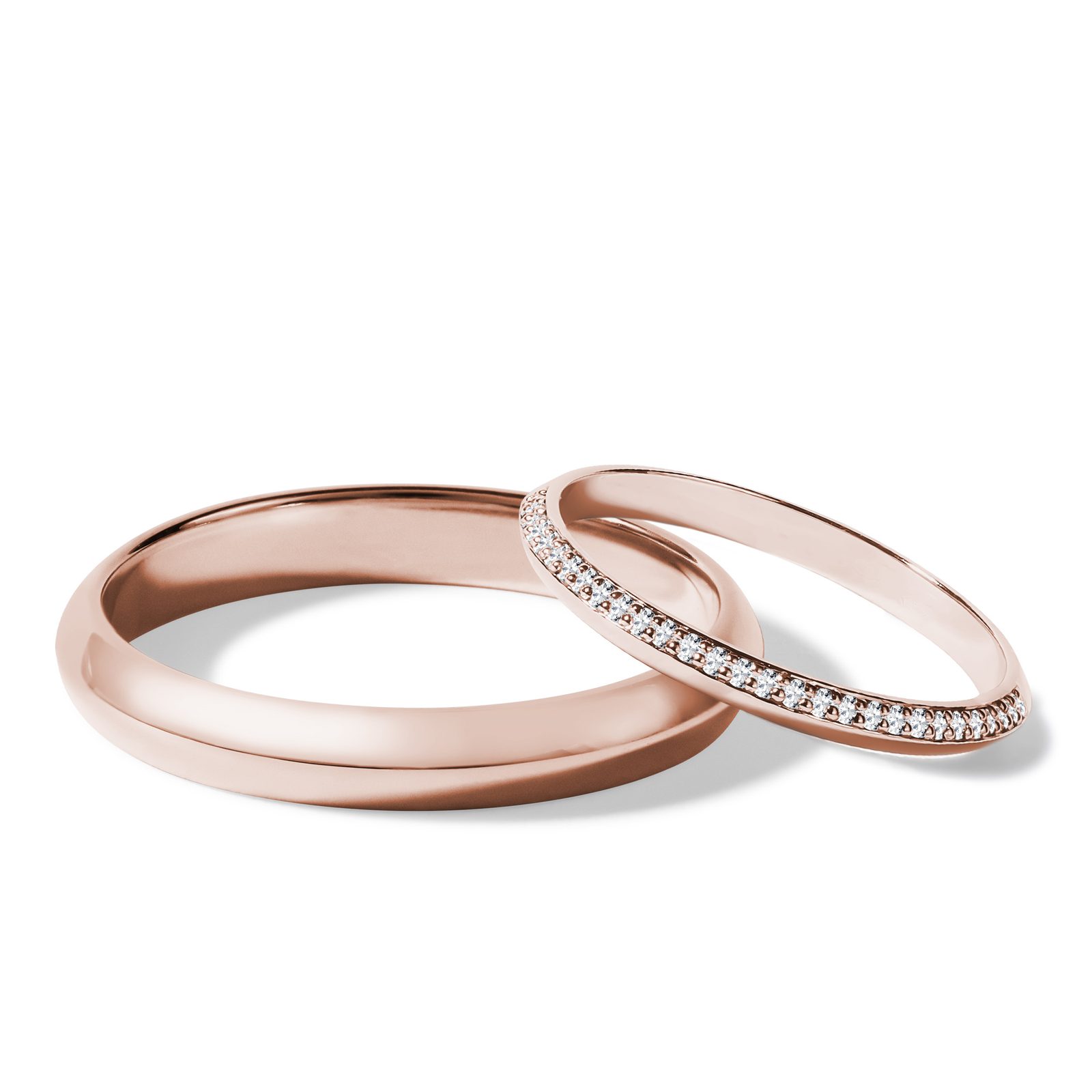 Originální snubní soupravu ze 14k růžového zlata tvoří spíše užší prstýnky se zajímavě tvarovaným profilem. Dámský prsten ve stylu half eternity zdobí po polovině obvodu drobné čiré brilianty zasazené do vrchní části šíny. Pánský prsten zaujme precizním zpracováním čistých linií. Set v sobě skvěle spojuje nadčasovou eleganci, moderní design a praktičnost.