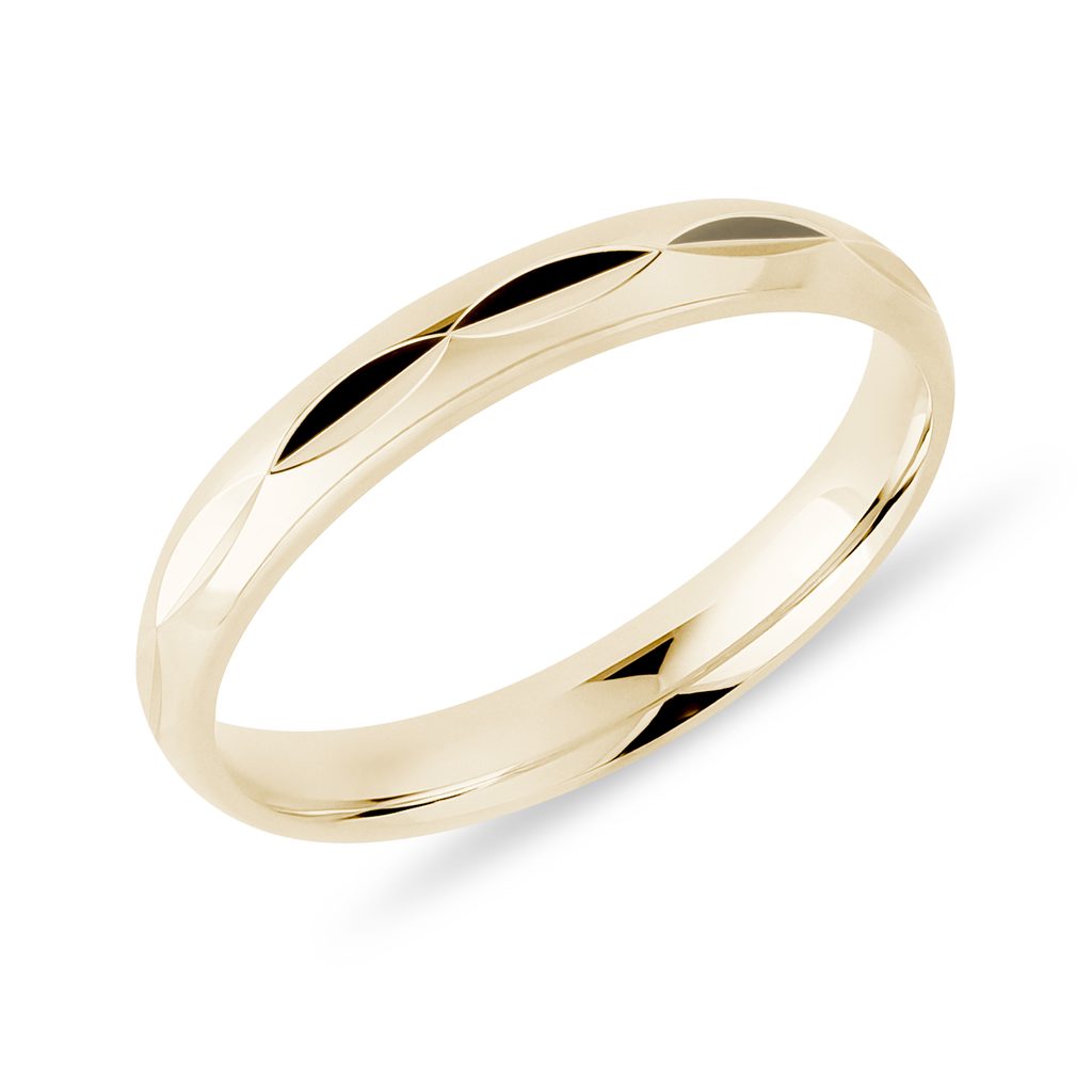 Dámský prsten ze žlutého 14karátového zlata zdobený jemnou rytinou. Šířka 3 mm vytváří ideální základ pro kombinování s dalšími prsteny a působí přirozeně, ať už ho nosíte k jednoduchému nebo výraznějšímu stylu. Hodí se také jako minimalistický snubní prsten.